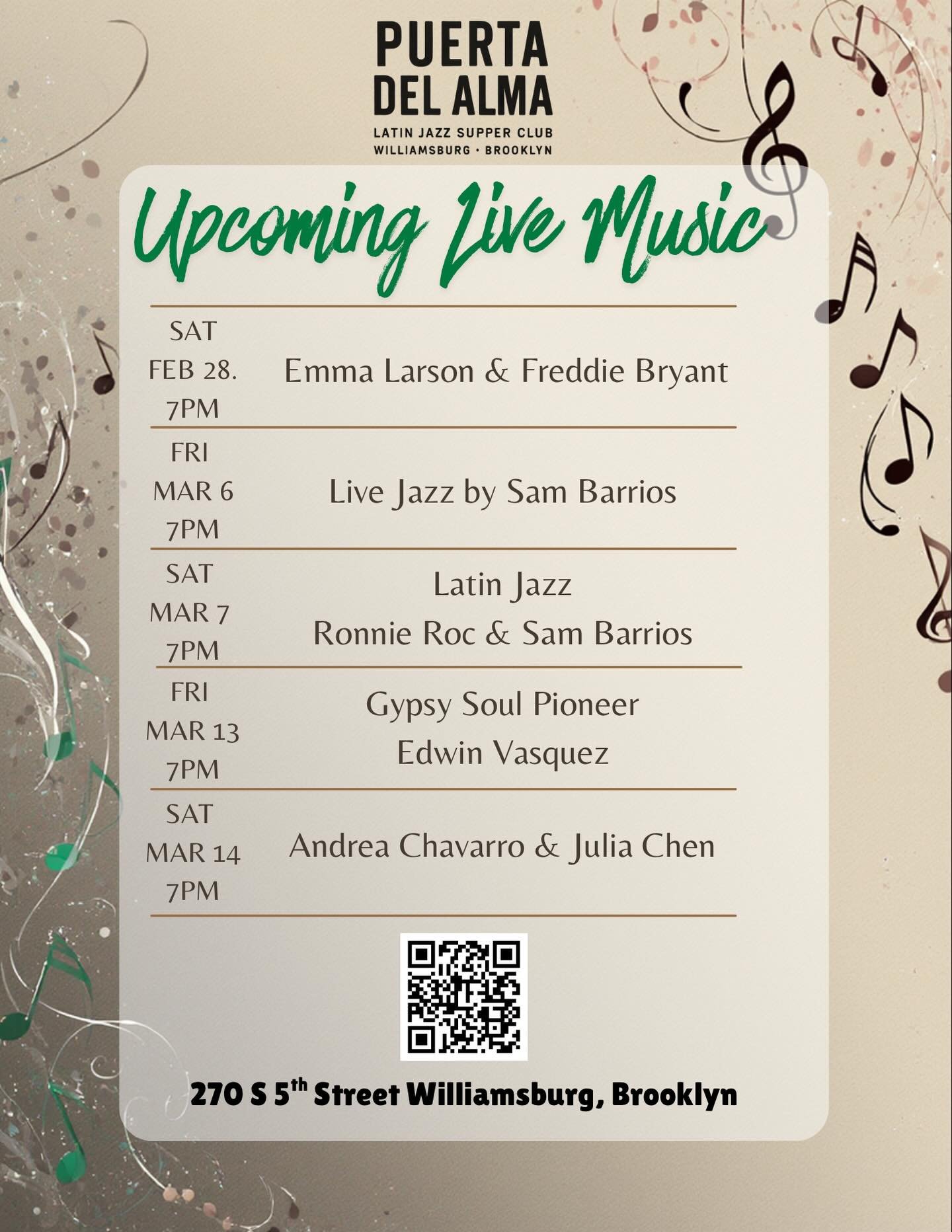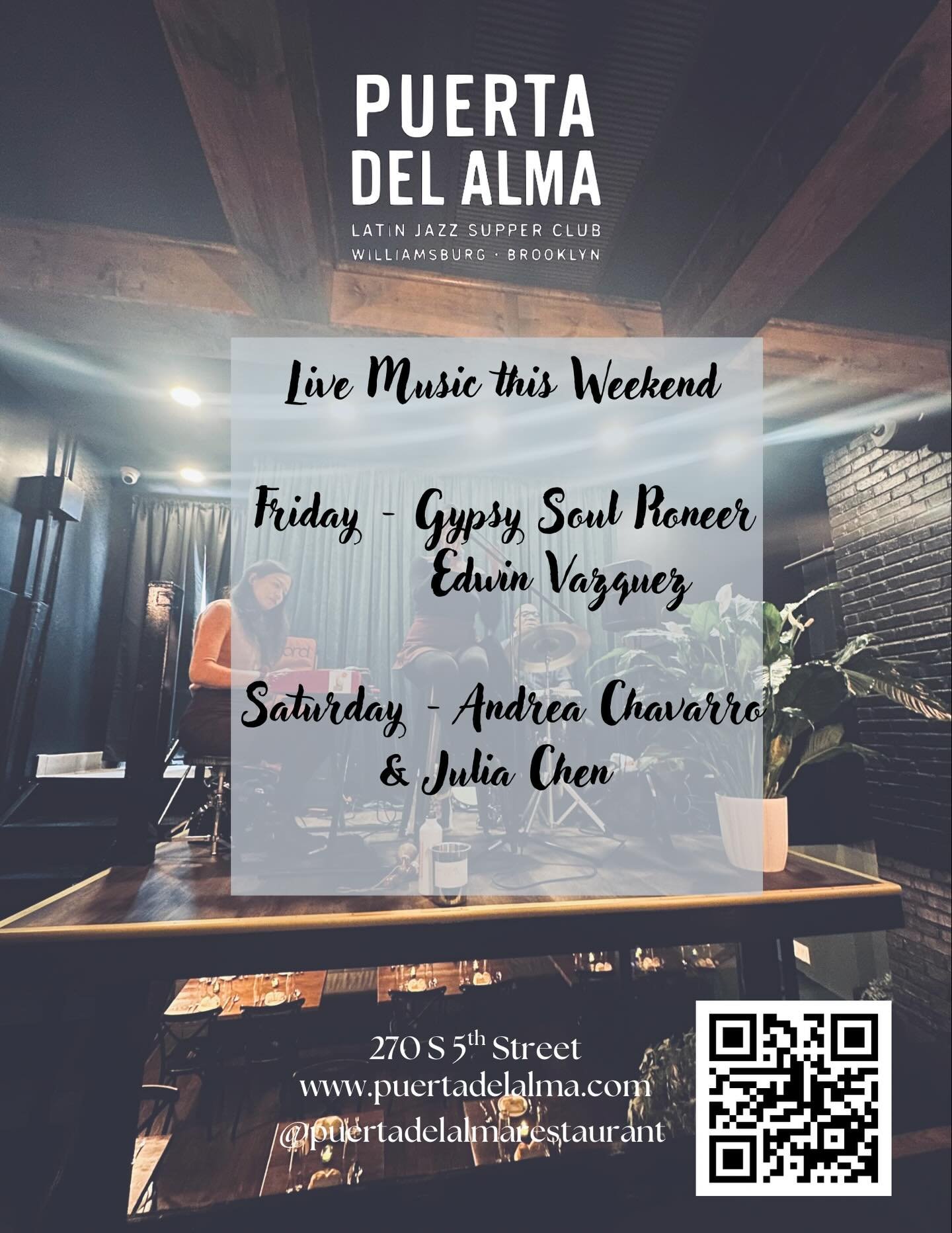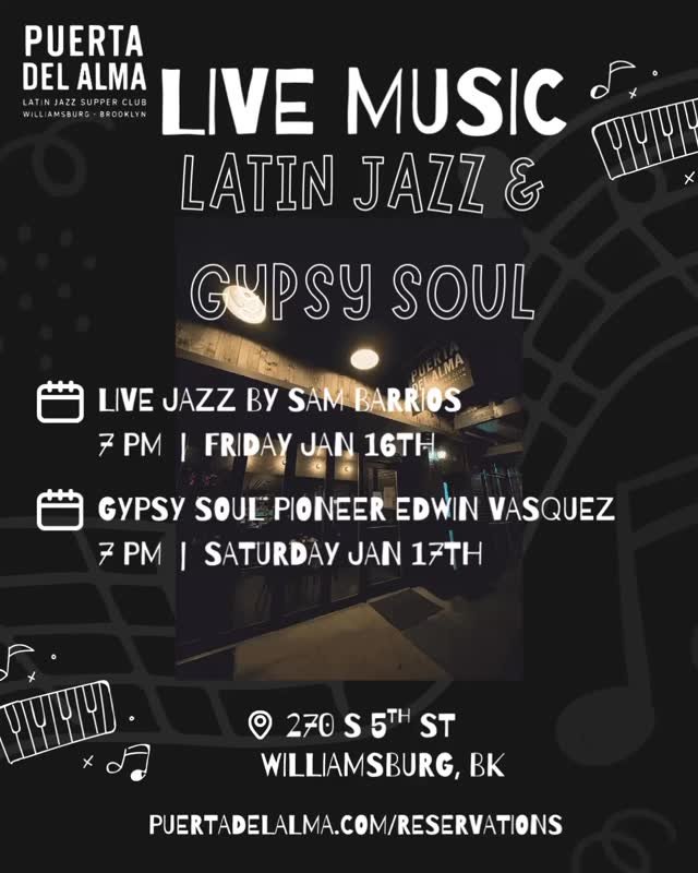 Born from a love of rhythm and Latin flavor, Puerta del Alma is a celebration of culture and connection. Created by Brooklyn restaurateurs devoted to the art of hospitality, itβs more than a restaurant β itβs an experience where Latin Jazz fills the air and passion fills the plate.